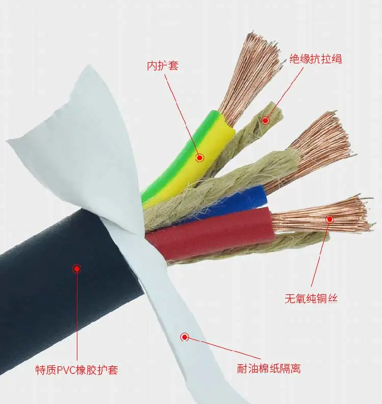 簡介:常見的橡套電纜中除家用型外還有防水型-適用于各類水下運行的電機,具有良好的防水性能,可在500V的交流電以下進行導電運輸且不會產生漏電、滲水風險;此外還有重型橡套電纜、野外作業專用橡套電纜,前者是用于港口、探照、重型機械電氣供應,后者則是用于野外作業,有防水防潮、耐磨耐腐蝕、耐動物撕咬等優良性能。